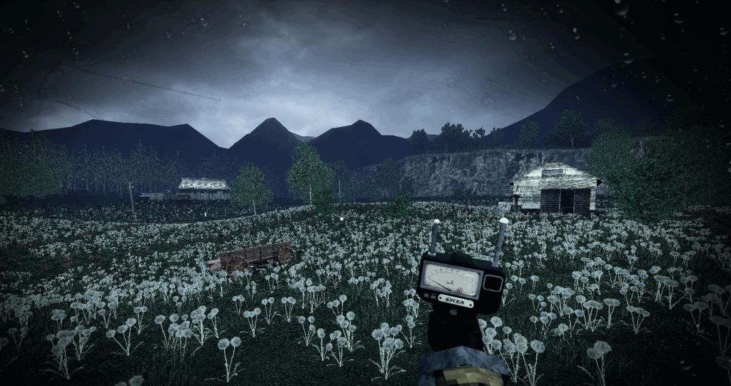 あたり一面に花が咲いている。ここに立っている建物には必ず木製風力タービンと大きな畑が配置されている。