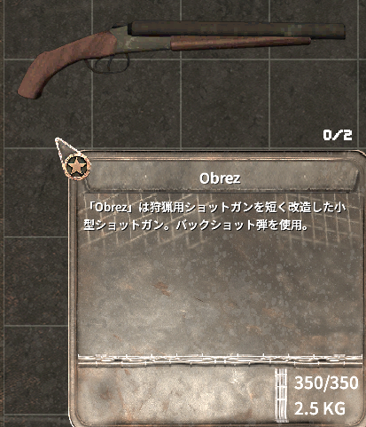 狩猟用ショットガン。ショットガンの中では威力は弱めで装填数も2発なので集団戦には不向き。